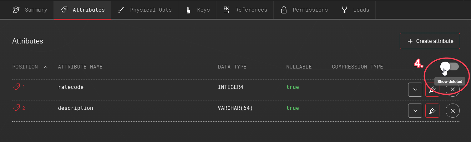 Entities contain attributes. Attributes are managed in the entity attributes tab where attributes can be created, soft deleted and restored.