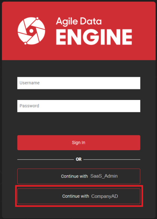 After the configuration is complete, navigate to your Agile Data Engine account and select Continue with CompanyAD: