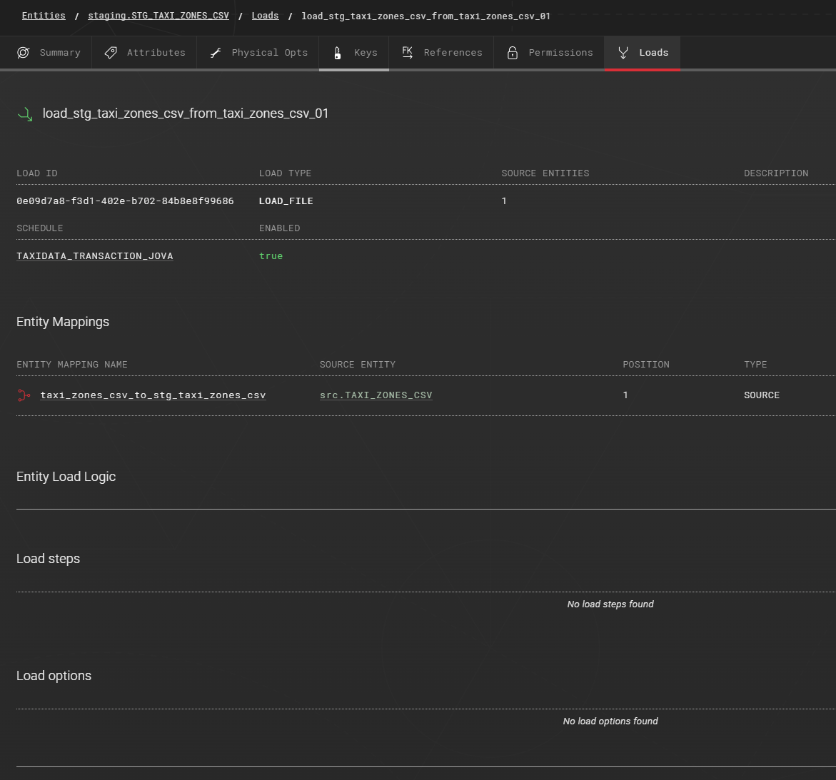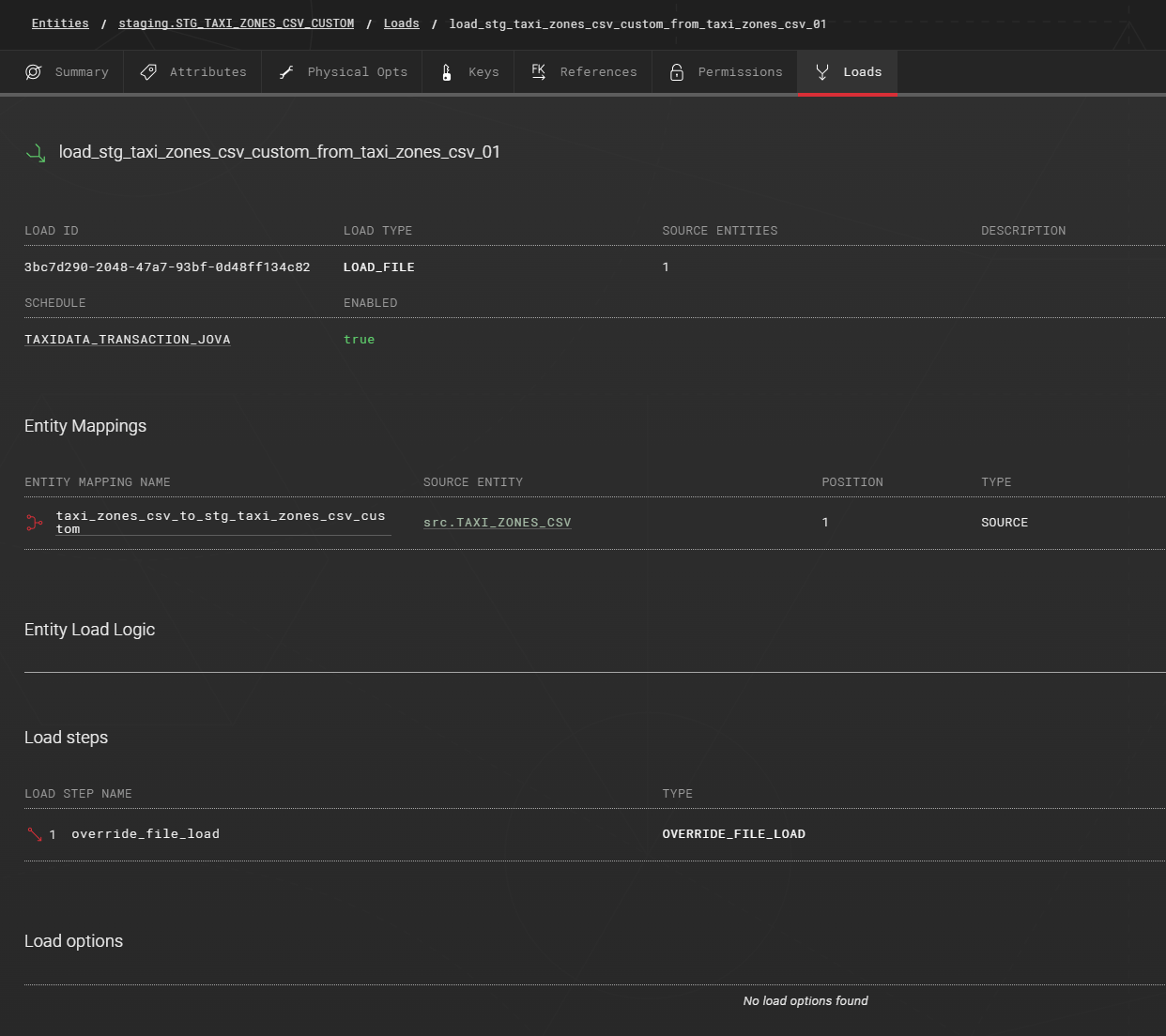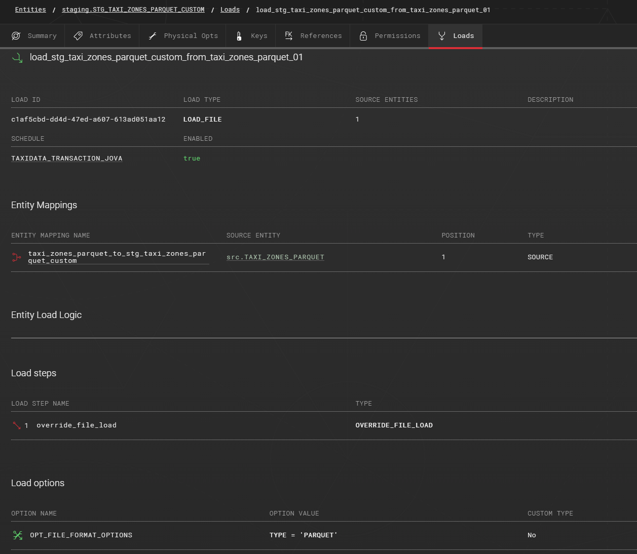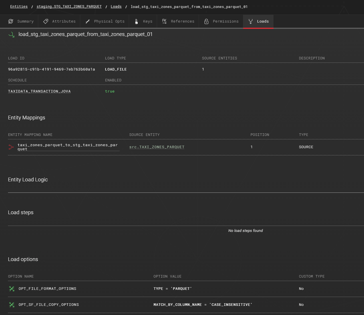 A load to the staging table from the METADATA_ONLY entity representing the external table is defined as follows.