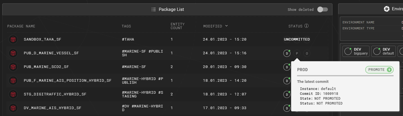 Indicator tooltip shows the promotion and deployment status of a package. It also provides actions to promote, demote and view further information regarding the latest deployment of a package.