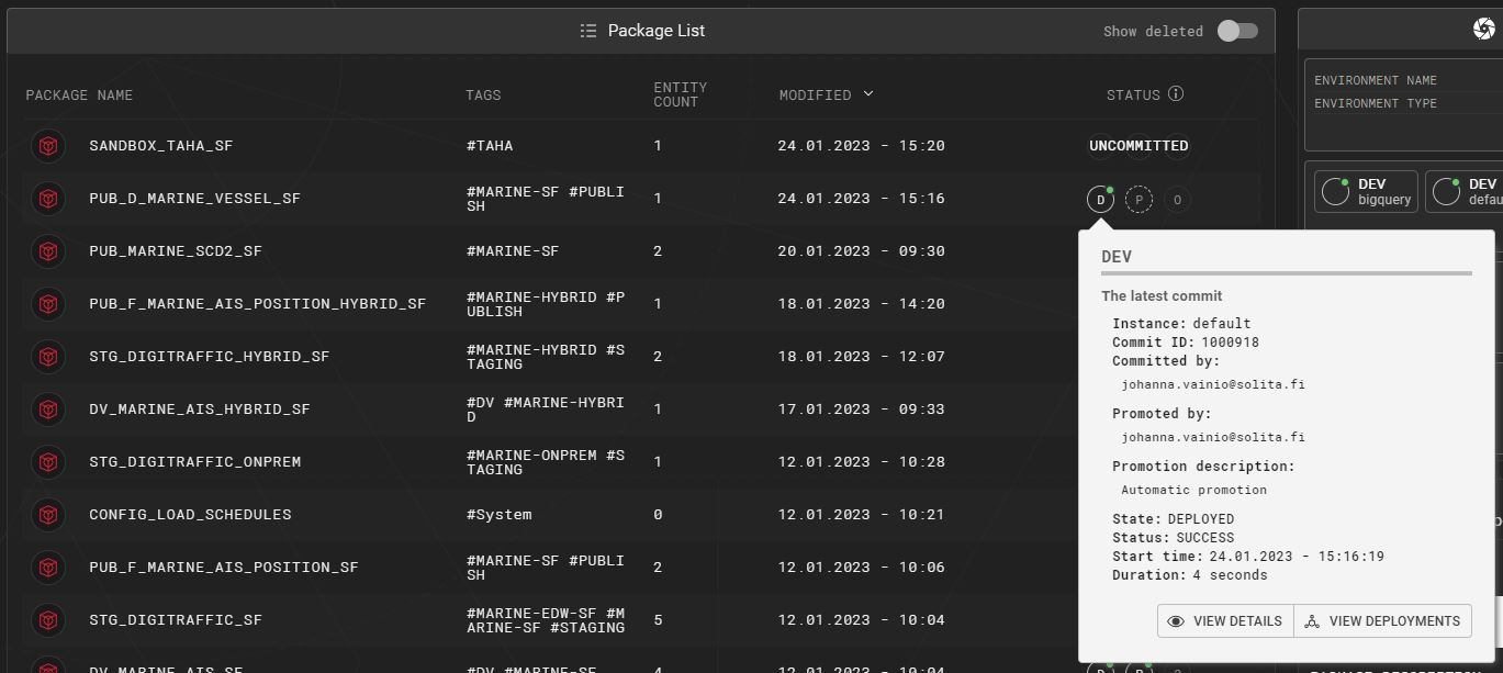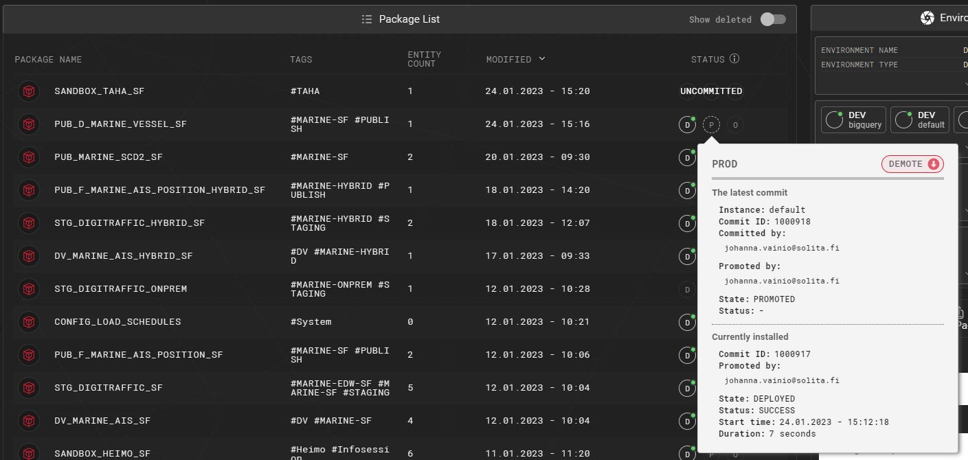 The tooltip also provides an audit trail, showing who has committed the latest changes and who has promoted them. When viewing the tooltip for a package in promoted state, the tooltip will also provide information regarding the currently installed changes, and who had promoted them: