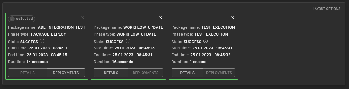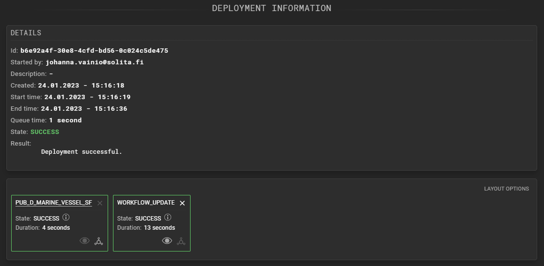 Shows detailed information regarding e.g. the duration and the result of the deployment: