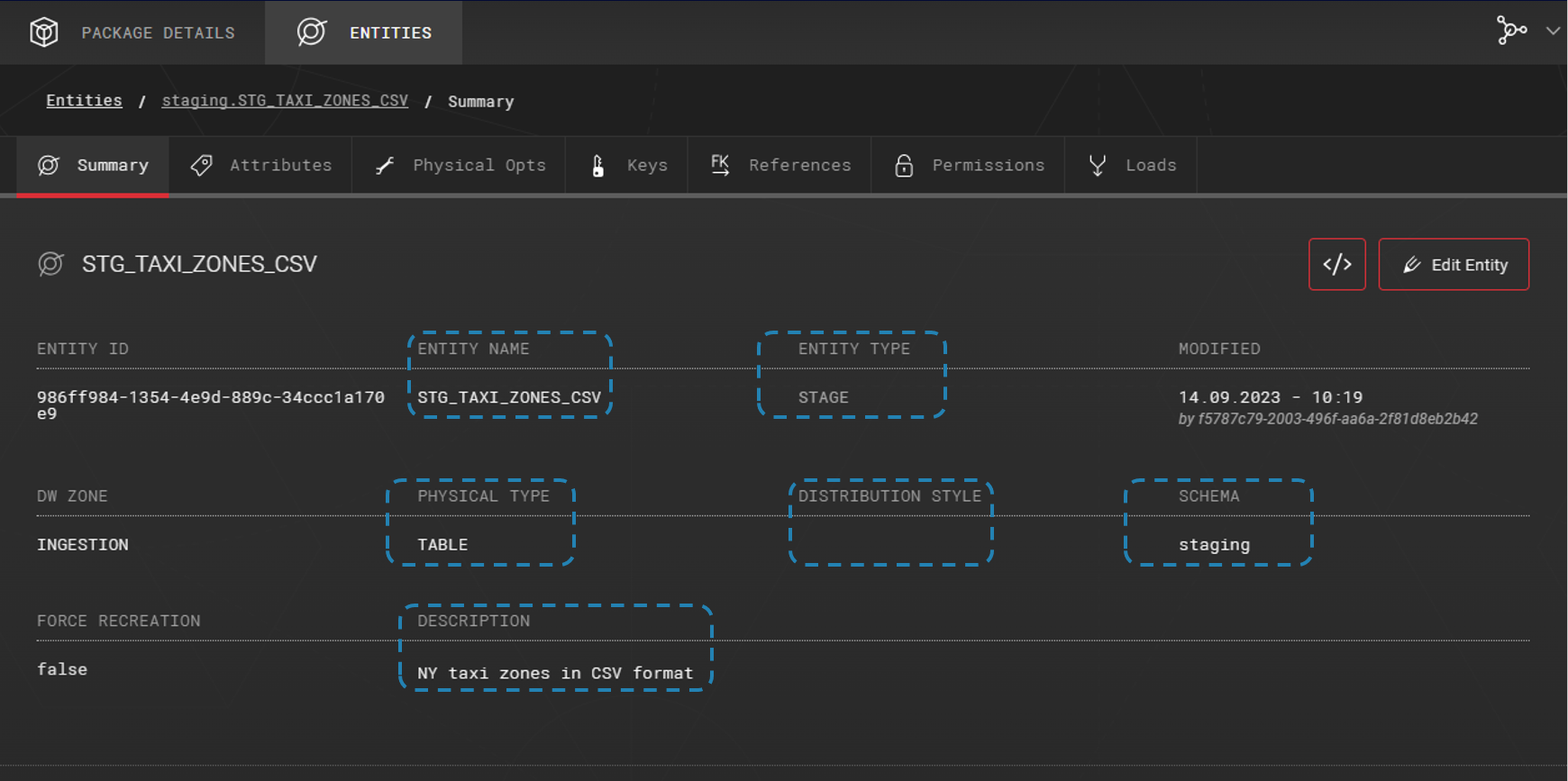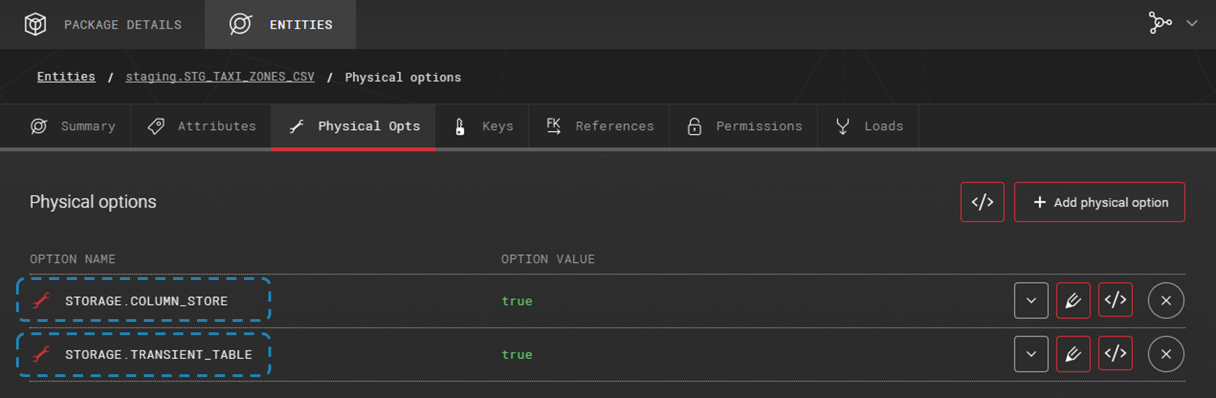 In the Physical options picture we see the physical options given to the entity. Some of the options are database product specific and are added only to DDL statements of database products that support them. For example, the STORAGE.COLUMN_STORE8 physical option is supported by Azure SQL Database and on Azure Synapse SQL. And the STORAGE.TRANSIENT_TABLE9 physical option is supported by Snowflake.