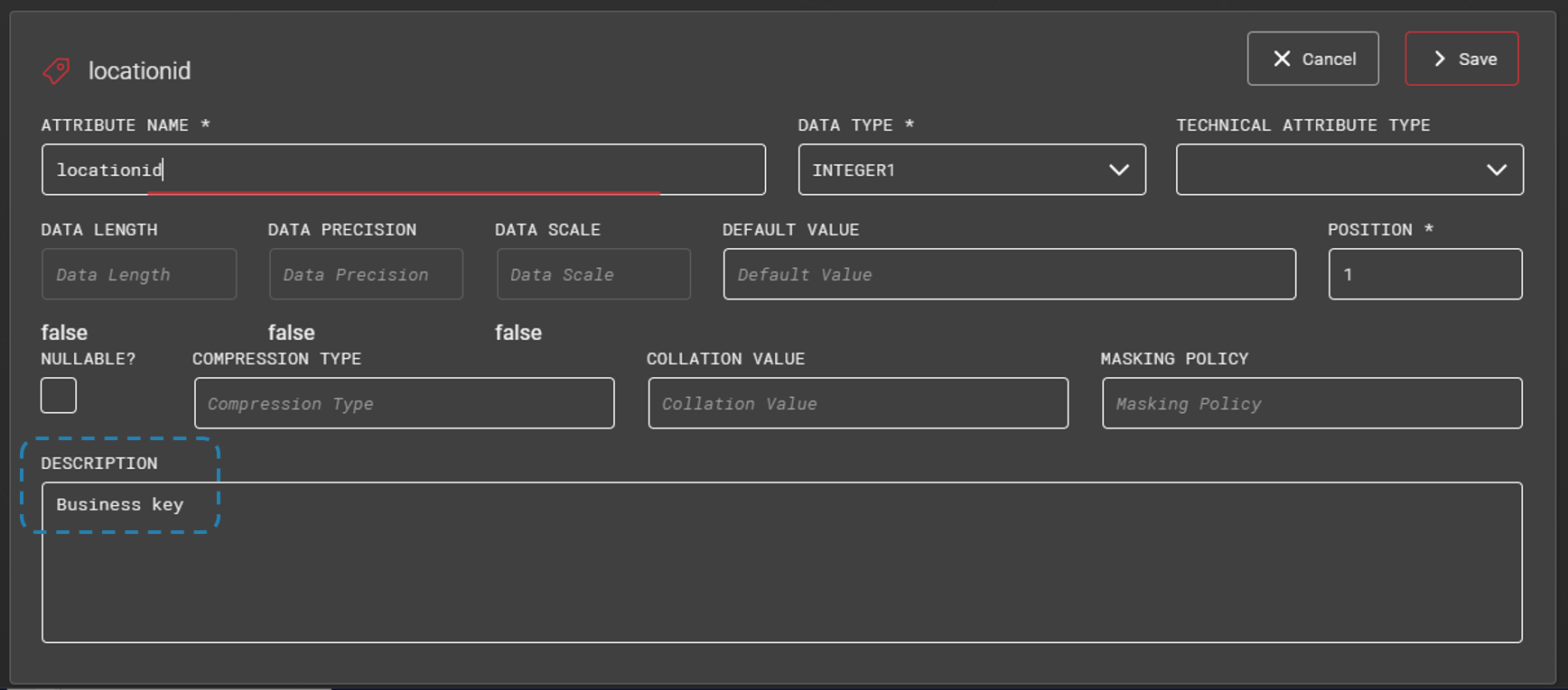 In the Attribute metadata picture we see a complete list of available metadata for an attribute such as the comment / description of the attribute7. This is where you can edit the metadata of the attribute. The changes are reflected in the DDL statements automatically and in the target database when the changes are deployed.