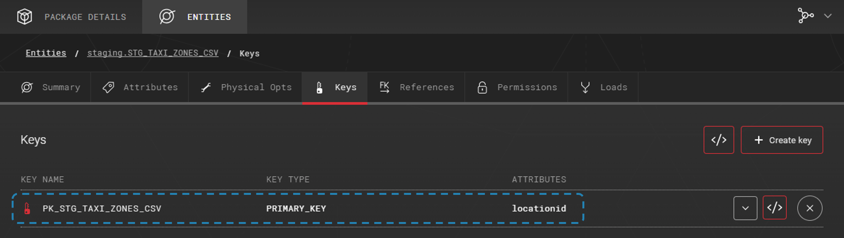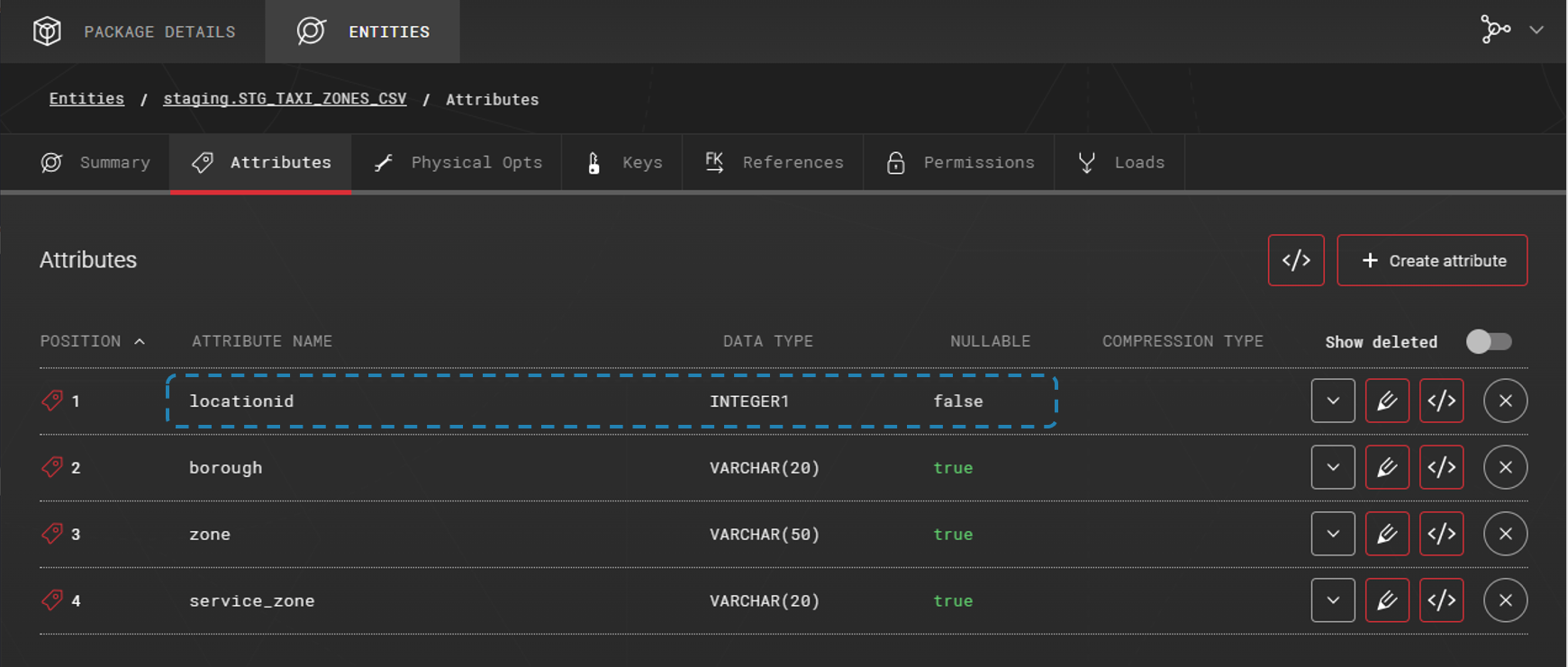 Because the physical type is table, Agile Data Engine creates a CREATE TABLE statement. The name of the table is STG_TAXI_ZONES_CSV, it is created on the database schema staging with a comment / description NY taxi zones in CSV format.