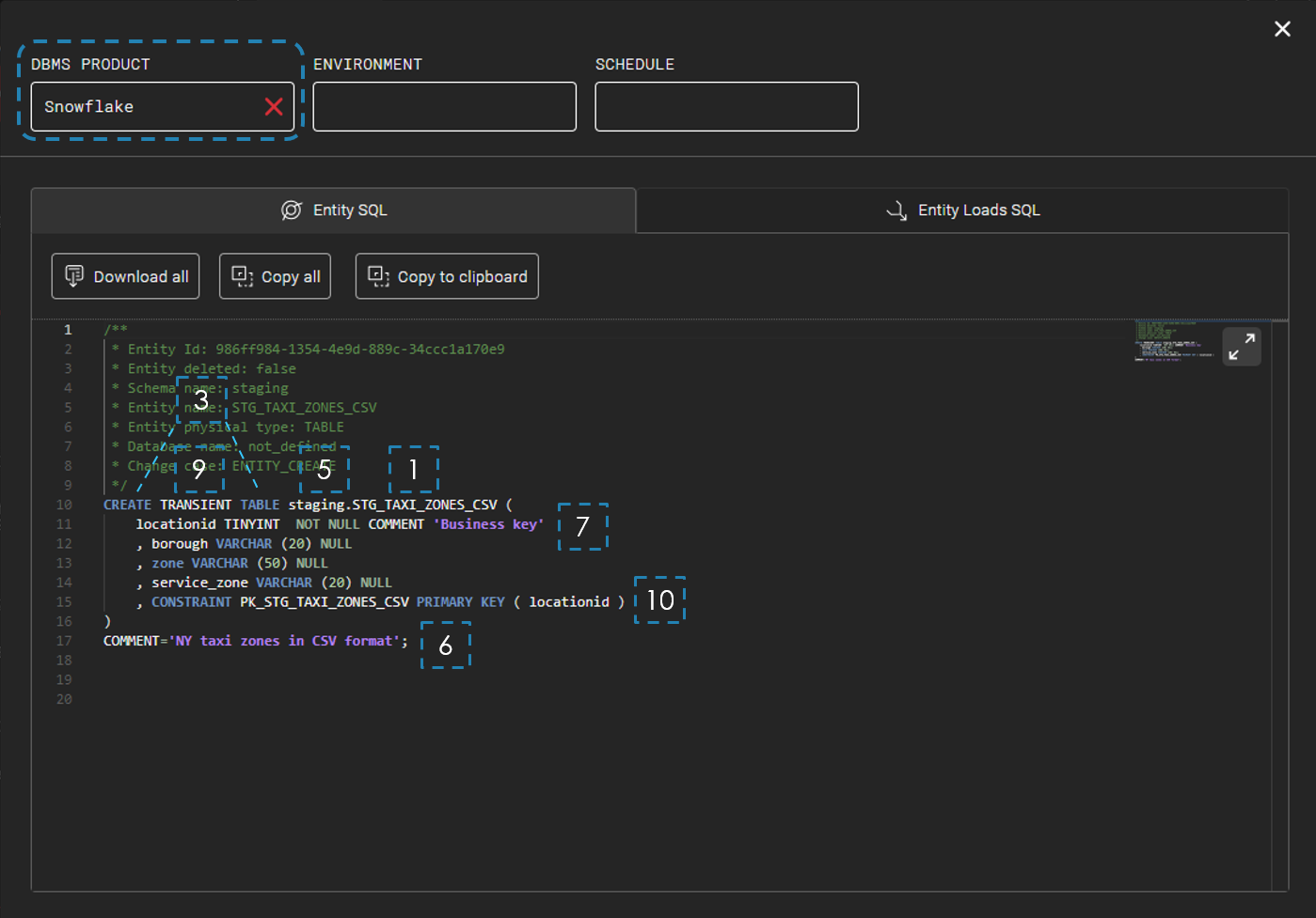 Agile Data Engine generates the following Snowflake specific DDL statement based on the previously provided metadata. The statement is a CREATE TABLE3 statement with the TRANSIENT9 keyword. The table’s name is STG_TAXI_ZONES_CSV1 created on the staging5 schema with a comment6. The attribute list is based on the defined attributes with the given data types, constraints, comments7 and so on. Finally, a PRIMARY KEY constraint10 is given.