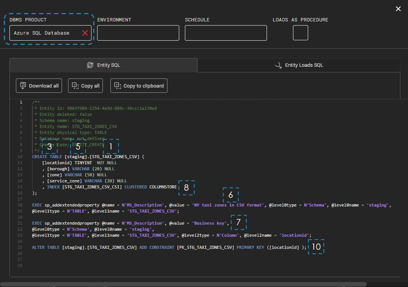 Agile Data Engine generates the following Azure SQL Database specific DDL statement based on the previously provided metadata. The statement is a CREATE TABLE3 statement. The table’s name is STG_TAXI_ZONES_CSV1 created on the staging5 schema. The comments6,7 are added as extended properties. The attribute list is based on the defined attributes with the given data types, constraints, and so on. A clustered COLUMNSTORE index8 is given based on the physical options. Finally, a PRIMARY KEY constraint10 is given.