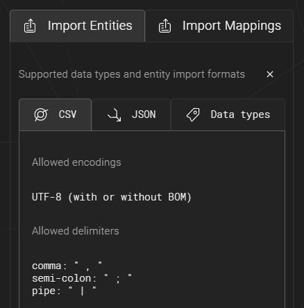 Entities can be imported into Designer with a CSV or a JSON format. This article focuses on the CSV format which is the recommended and common way of importing entities.