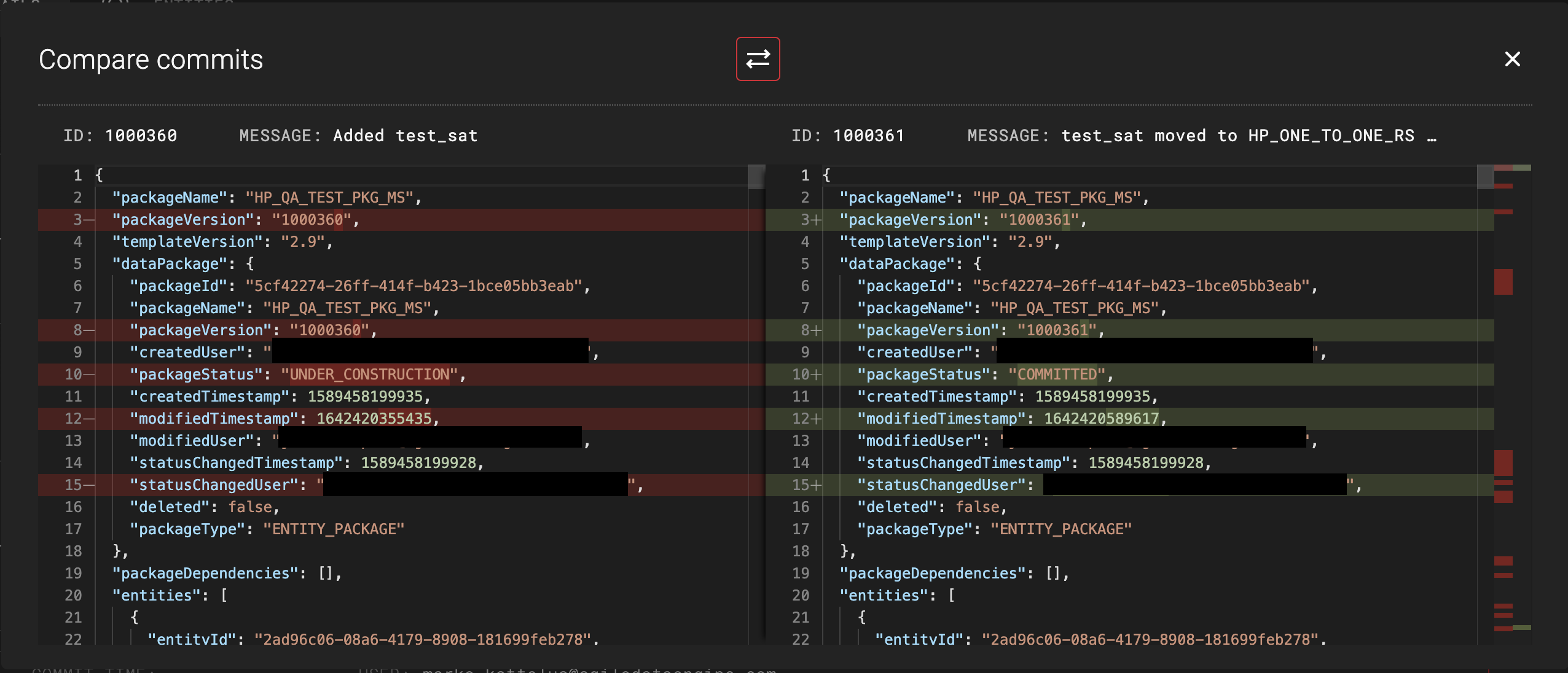 Package commit view shows the package change history and enables comparison of metadata changes between different versions.