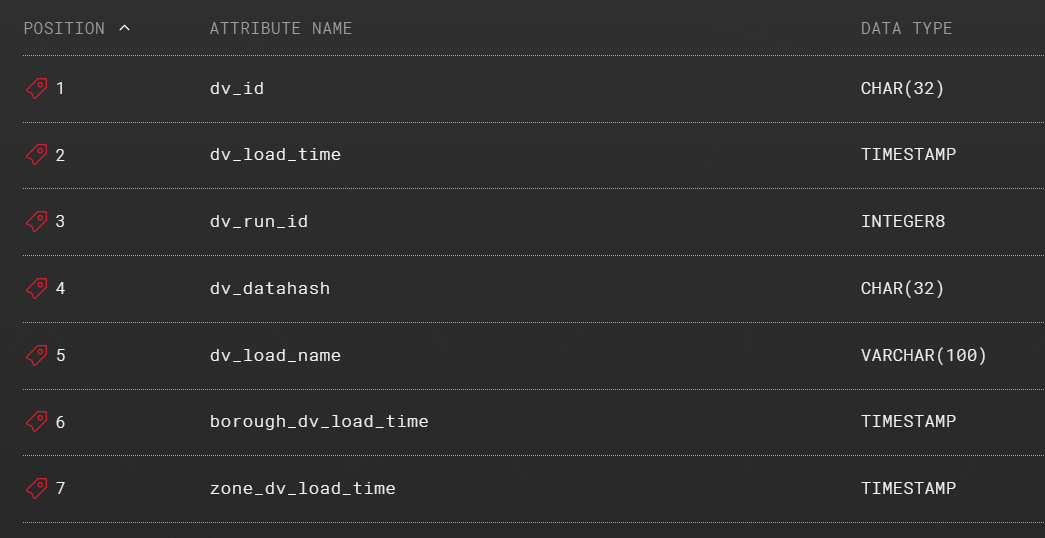 <hub_entity>,<sat_entity_1>,<sat_entity_2>, and possible other<sat_entity_x>entities with their correct names. You need to have as manyLEFT JOINcommands as you have source satellites. In our example, the source entities are H_TRIP_TAXI_ZONE, S_TRIP_TAXI_ZONE_ZONE, and S_TRIP_TAXI_ZONE_BOROUGH.Modify the