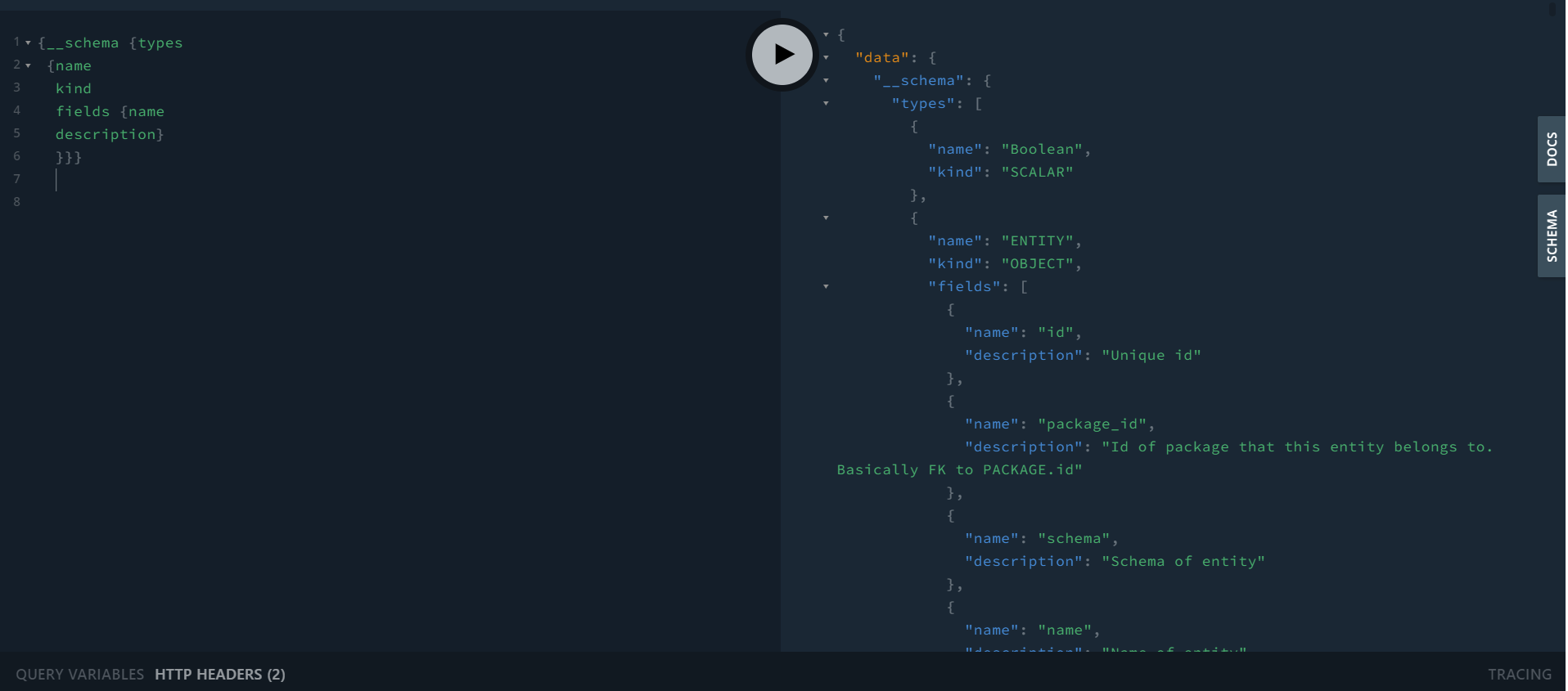 GraphQL Playground has schema and docs tabs. The schema tab has a list of types and their fields and the docs tab has a list of queries and types related to the selected query.